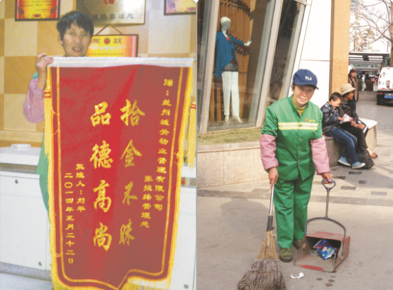 徐小琴是物業(yè)公司張掖路分公司的保潔員,她已在這一崗位上工作了11年。11年間,她撿還了無數(shù)錢包、卡證……徐小琴在自己平凡的崗位上堅(jiān)持的不止是簡(jiǎn)單的打掃街道,更是演繹著愛心不停歇的拾金不昧精神。