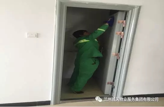 正在擦拭宿舍樓內(nèi)的樓梯間門上的灰塵