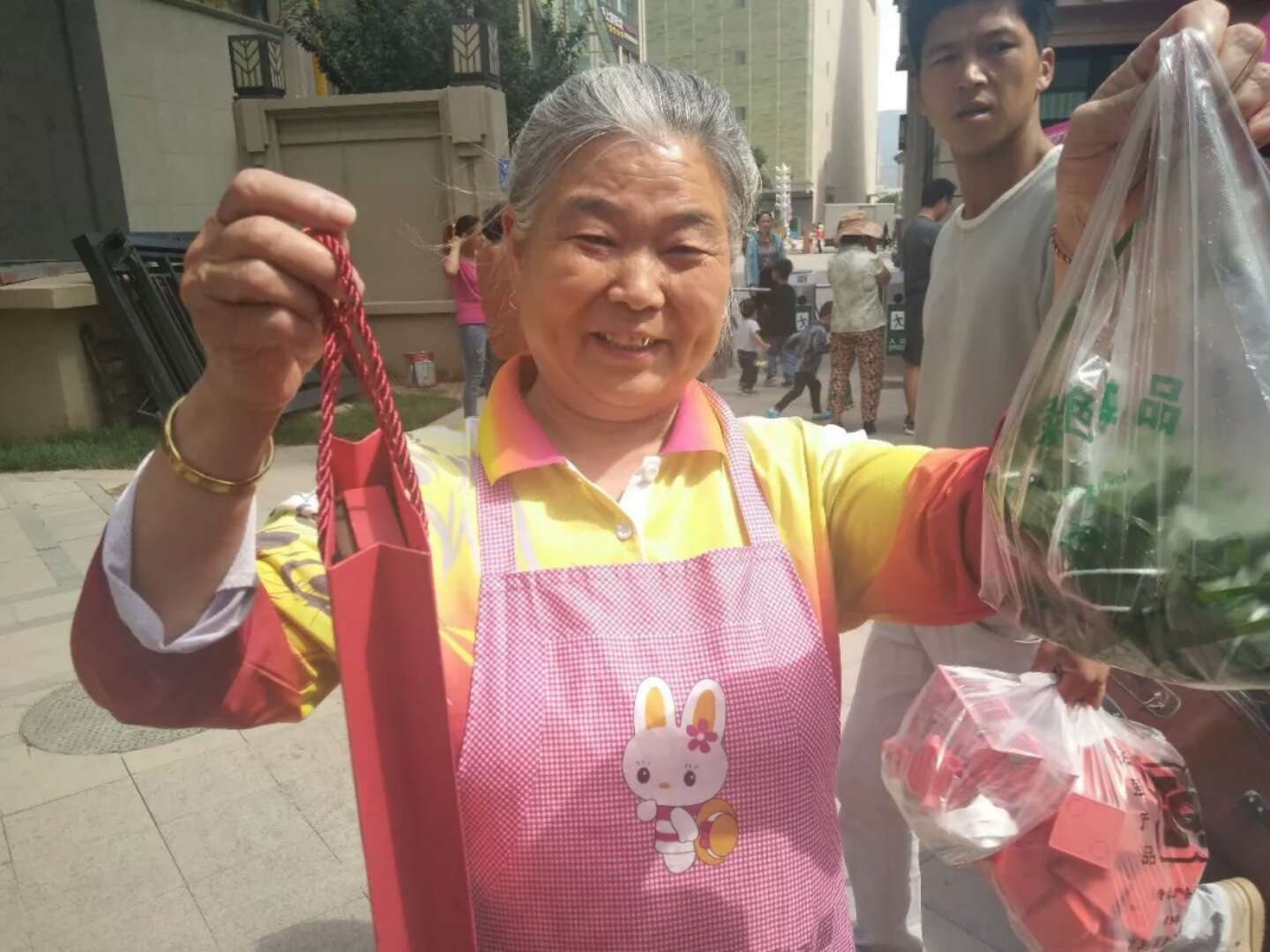老奶奶系著圍裙,體驗(yàn)著比賽樂趣。