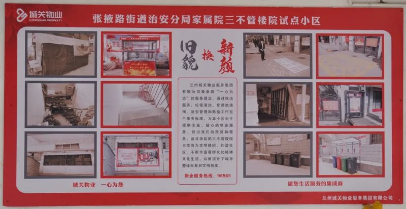 蘭州城關物業(yè)全面接管城關區(qū)老舊樓院后,采取先期介入、分層改造等新模式,啟動實施“三不管”樓院物業(yè)全覆蓋整治工作,通過環(huán)境衛(wèi)生改造,基礎設施維修,安全秩序維護等方面工作,把‘三不管’樓院變成‘三要管’。我們將繼續(xù)努力,持續(xù)推進城關區(qū)老舊樓院改造,不斷引入多元化服務,全面提升服務質(zhì)量,提升業(yè)主的幸福感和滿意度!